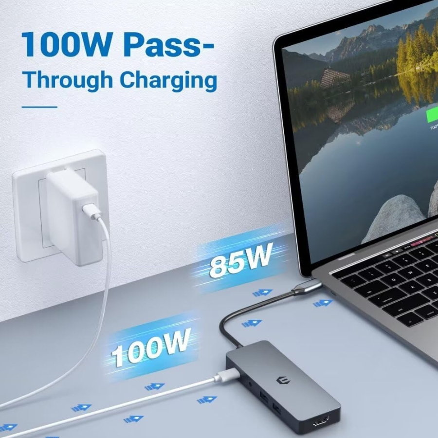 Docking station-ul este echipat cu port USB-C PD de 100W, ce asigura incarcarea rapida a laptopului, fara a compromite utilizarea celorlalte porturi. Astfel, poti conecta simultan mouse-ul, hard disk-ul extern sau alte periferice, mentinand o alimentare stabila si sigura. Ideal pentru birou, meetinguri sau lucru remote.